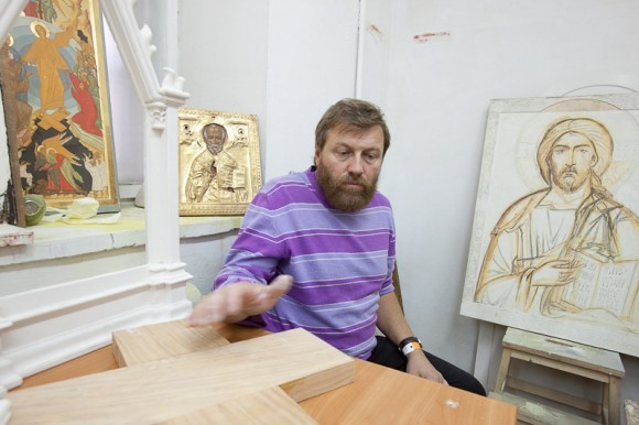 А фотоаппарат со вспышкой можно? – спрашивает у иконописца Александра Соколова моя восьмилетняя дочка, приготовившись снимать в его мастерской. «За отдельную плату», — шутливо отвечает мастер.