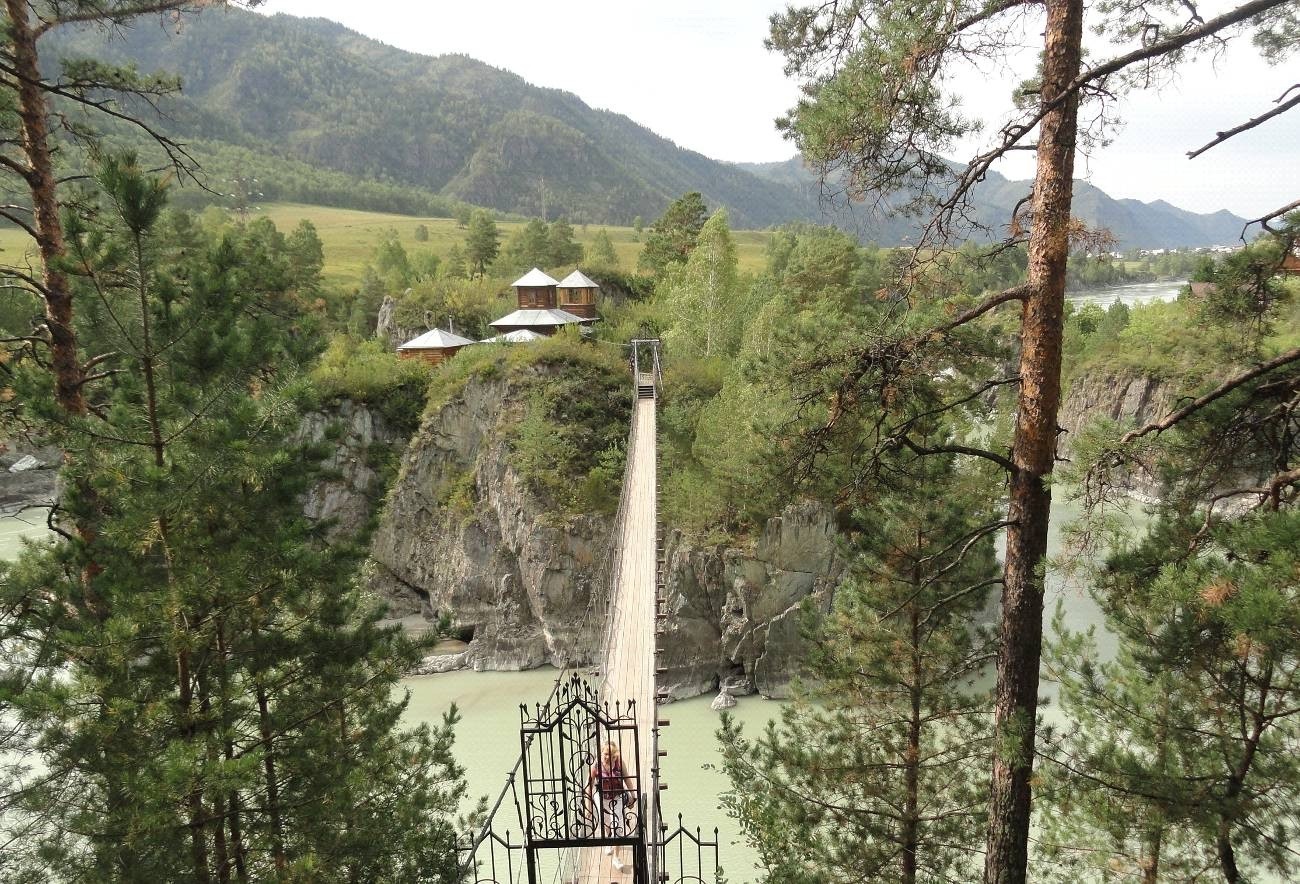 Например, висячий мостик, который соединяет берег Катуни с островом. Понятно, что он функционален: там нельзя было сделать капитального моста. Но в том контексте, в той среде, которая возникает для людей, идущих по этому колеблющемуся мостику, он становится своего рода образом веры многих и многих: нетвердый, нащупываемый с неким страхом путь к Истине.