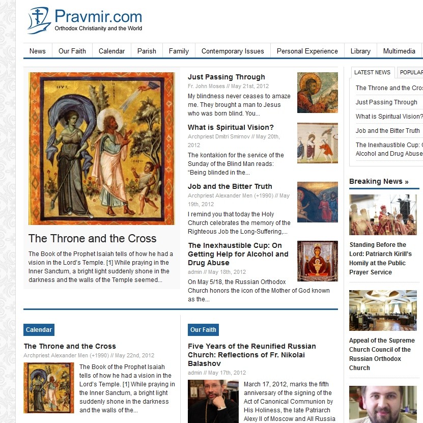 версия портала «Правмир» на английском языке PRAVMIR.com — известный и посещаемый сайт, который рассказывает о православии, о Христе католикам, протестантам, где обсуждаются важные вопросы церковной жизни и православия в мире.