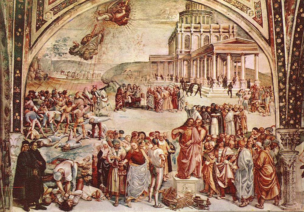 Почему же итальянский художник именно так изобразил Антихриста? На этот вопрос нам поможет ответить обращение к древнегреческому слову ὁ ἀντίχριστος (antichristos), переводом с которого и является русское слово антихрист. Дело в том, что в древнегреческом языке приставка ἀντί (anti) имеет два значения. Ее можно переводить не только как «против», но и как «вместо». То есть антихрист – это не только противник Христа. Это также и тот, кто попытается собой подменить Спасителя, выдать себя – за Него. Как и Христос, он будет творить чудеса, у него тоже будут свои ученики и свое подобие Церкви. Как и Христос, он будет открыт для всех людей, наций и культурно-религиозных традиций, и для него так же не будет ни эллина, ни иудея. Он будет обольщать людей чудесами и материальным благополучием. Но как раз перед самым концом света, когда все люди на Земле с облегчением будут говорить: «…“мир и безопасность”, тогда внезапно настигнет их пагуба» (1 Фес. 5, 3).