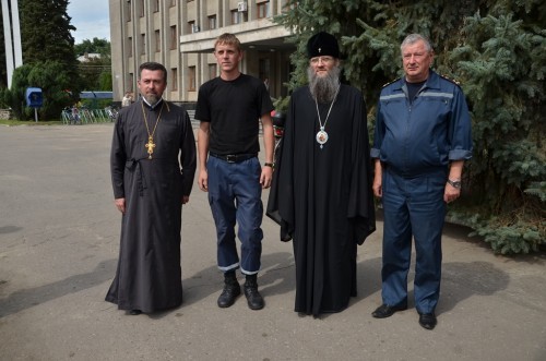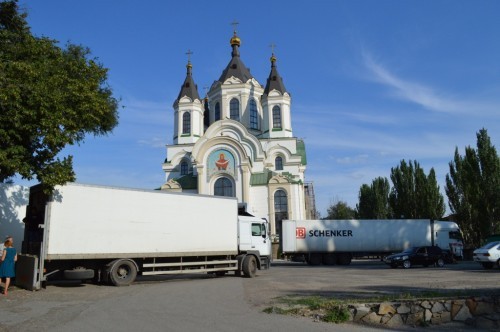 После совершения Божественной литургии, которую возглавил Местоблюститель Киевской митрополичьей кафедры митрополит Черновицкий и Буковинский Онуфрий, с протоиереем Олегом Семенчуком и группой журналистов запорожского ТВ-5 мы направились в город Славянск. На въезде в город Славянск со стороны города Краматорска на блокпосте нас уже встречали две фуры, загруженные гуманитарной помощью в городе Запорожье накануне, 20 июля.
