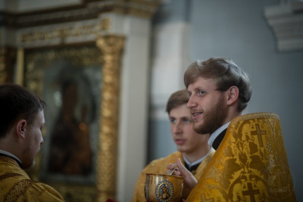 Представьте себе ситуацию. Только что мы, словно ангелы во плоти, пели: «Иже херувимы тайно образующе…»; затем, во время Евхаристического канона, я, облаченный в одежду Царства Небесного, призывал верующих устремить сердца горé, ввысь, и с кадилом в руках, воскуряя ладан Духу Святому, благословляя молящихся словами: «Мир всем!», молился о претворении честных даров.