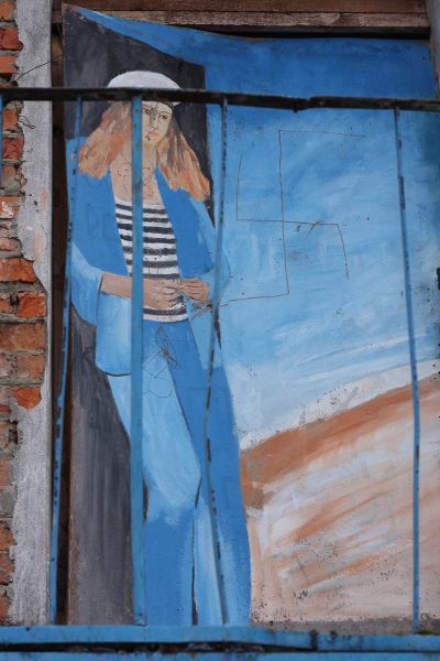 На той стороне нас встречает «Морячка» — девушка в матросской форме, стоящая в проеме второго этажа, еще одна работа художника. Красивая и яркая, она, задумчиво облокотившись об косяк, смотрит на реку.