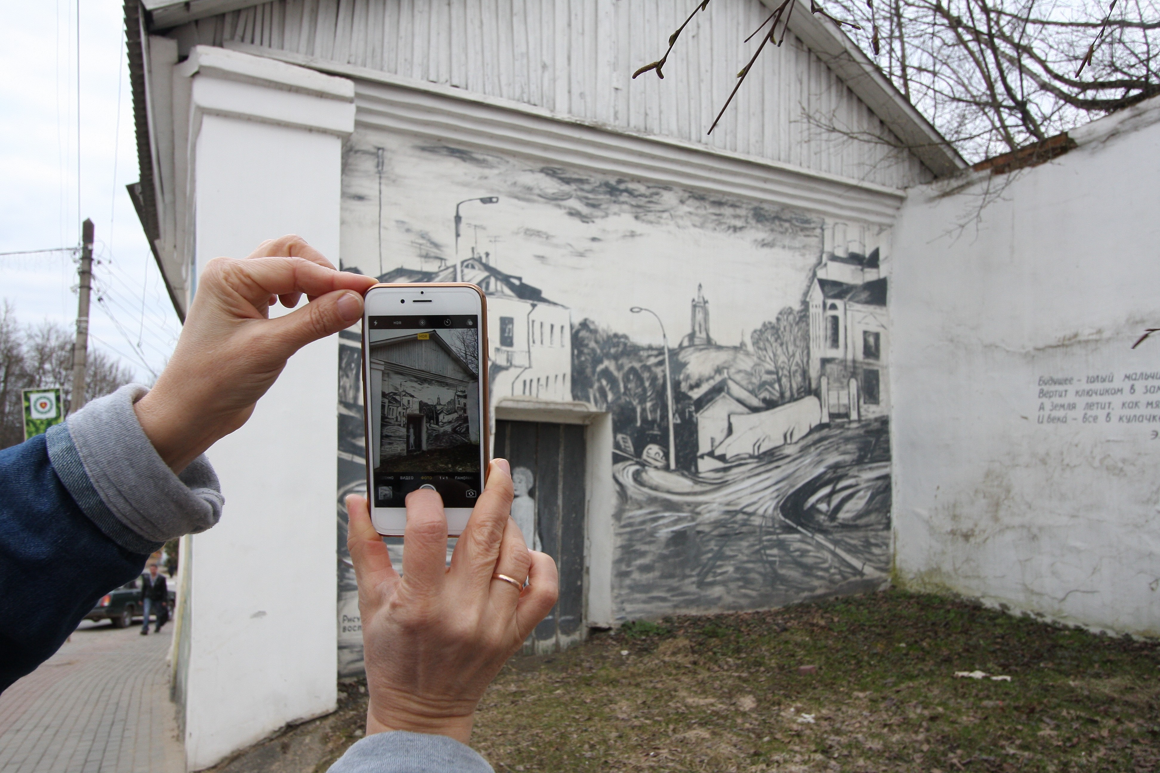 По дороге в центр мы встречаем кого-то из местных депутатов, и Овчинников затевает с ним долгий разговор о своих делах, связанных с памятником. Они разговаривают рядом со старым особняком – деревянный второй этаж на каменном фундаменте, где в окне сидит нарисованная Владимиром Александровичем кошка на фоне будто бы отражающейся в окне колокольни.