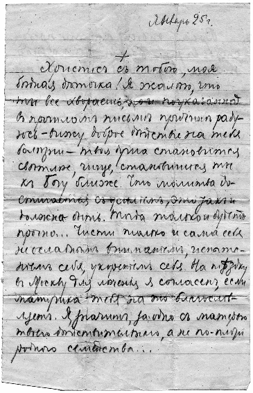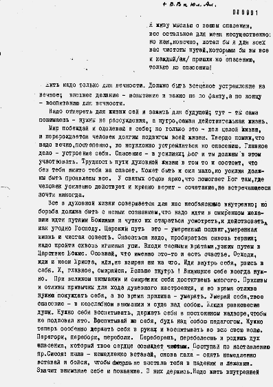 В Высоко-Петровских общинах имела место довольно интенсивная литературная деятельность, о чём нам позволяют судить сохранившиеся материалы девяти личных архивов тайных монахинь и прихожанок Высоко-Петровского монастыря. Общий объём этих архивов превышает две тысячи листов, из которых более половины приходится на рукописи различного содержания, а остальное — на материалы самиздата и фотографии. Жанровое разнообразие этих материалов очень велико: это проповеди, письма, воспоминания7 и такие уникальные документы, как ответы на исповедания помыслов. Дело в том, что важной особенностью зосимовской традиции была развитая практика духовного руководства новоначального монаха со стороны более опытного (старчество), выражавшегося, в частности, в ежедневном письменном исповедании помыслов старцу. Под помыслами (logismТj) восточно-христианская аскетика имеет в виду не только собственно греховные мысли и переживания, но и любые, в том числе — добрые и нейтральные образы, чувства, идеи, появляющиеся на мысленном горизонте подвижника. Все они должны быть принесены на суд духовному руководителю, в чём и состоит суть практики “исповедания помыслов”. Значительную долю Высоко-Петровского архива как раз и составляют ответы зосимовских духовников на такие исповедания своих пострижеников. Именно они и будут в центре нашего внимания, тем более что большая часть этих ответов дошла до нас в виде маргиналий в буквальном смысле слова — заметок на полях и между строк самих записок с исповеданием помыслов.