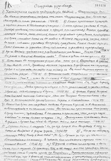 Высоко-Петровского монастыря, постриженика Зосимовой пустыни епископа Варфоломея (Ремова). Все они посвящены празднику Введения во храм Божией Матери и были сказаны в один день (в сам день праздника, 21 ноября по старому стилю) в течение пяти лет: с 1928 по 1932 годы. В архиве присутствуют также записи изречений на другие темы — аскетические, пастырские, датированные и не датированные. Обратим внимание, что здесь изречения уже структурированы тематически. В виде таких сводных выдержек могли бытовать не только устные изречения, но и фрагменты из ответов на исповедания помыслов. Вполне возможно, что именно с ними мы имеем дело в случае с текстом на илл. 10.