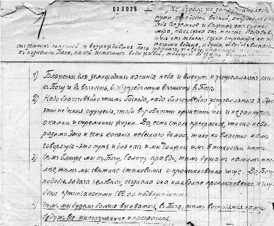 Однако эти записи устных и письменных изречений, структурированные тематически, но ещё чётко отделённые друг от друга и существующие как соположенные, но всё же отдельные высказывания, были только вторым, промежуточным этапом в бытовании изречений старцев Высоко-Петровского монастыря. Совершенно очевидно, что дальше они объединялись в крупные тексты (илл. 11) — развёрнутые и пространные аскетические поучения. В 1996 г. при первой публикации мы квалифицировали