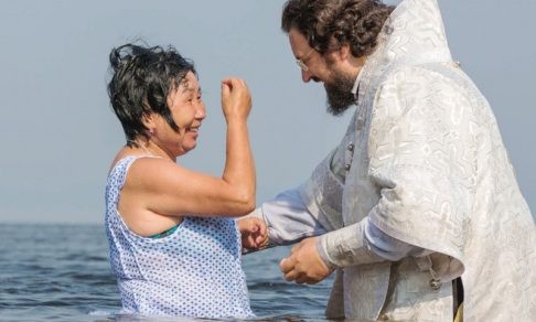 Под якутские и славянские слова, несущиеся в небо, скалы превращаются в колонны собора, синее небо — в купол, ну а Лена — в огромную купель...