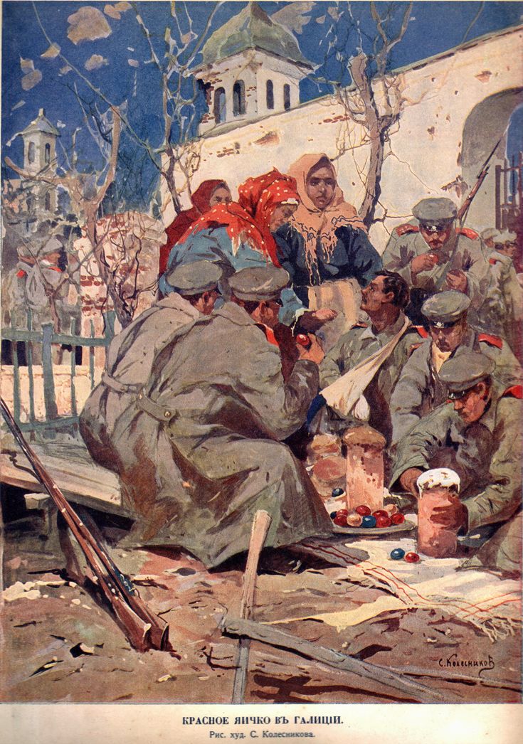 В 12 часов ходил к командиру, добрейшему А.К. Ремезову. Хозяйственная часть полка послала пасхальный стол обществу офицеров, солдаты тоже получили пасхальные пайки. Все это устроено заботами начальника хозяйственной части капитана А. Я. Б. Спасибо ему! На месте трудно что-то было приготовить, все необходимое привез из Львова капельмейстер Ст-в. На позиции пасхальная снедь была отправлена своевременно.