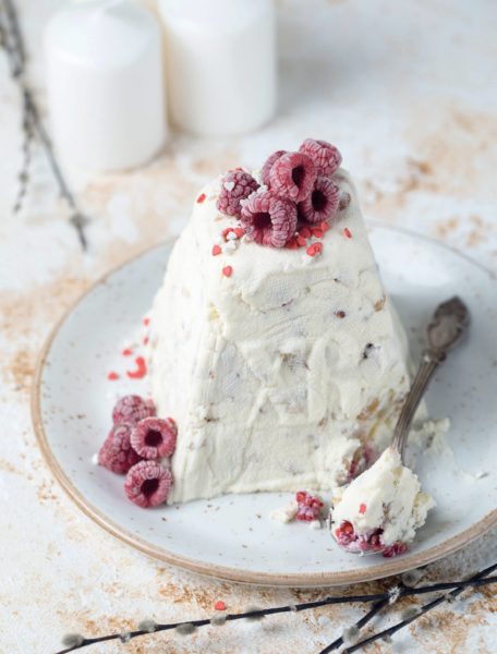 - Взбить блендером рикотту, маскарпоне, сахарную пудру и ваниль до однородной массы. Добавить измельченные орехи, изюм и малину. Аккуратно перемешать.