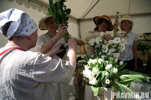Белые цветы в изобилии, а женщины - в старинных нарядах - в воспоминание о старинной традиции благотворительного праздника