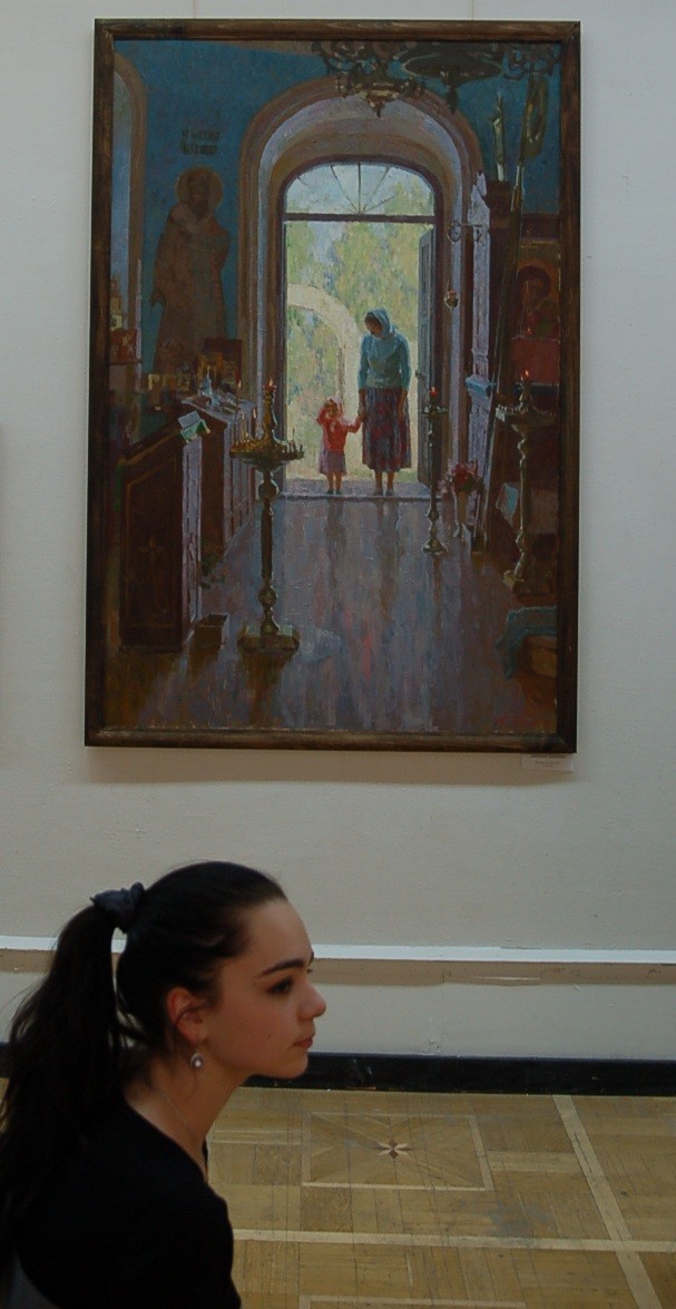 Очень искренняя, светлая работа Анны Боганис «Введение во храм». Она пишет интерьер храма не потому, что сегодня «так принято», а — делится своими материнскими радостными переживаниями.