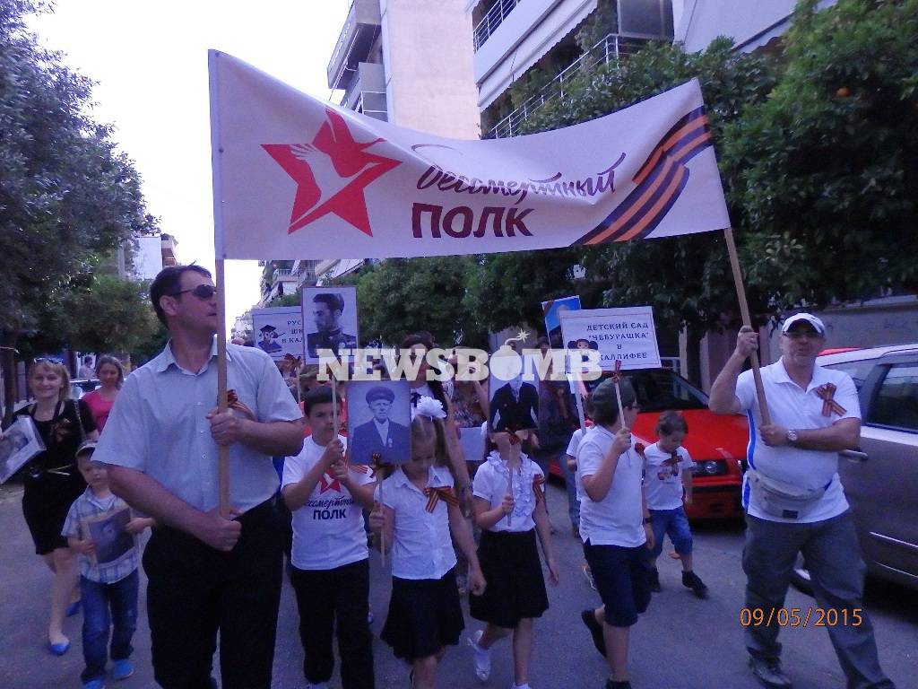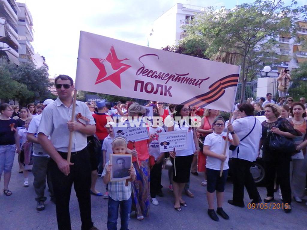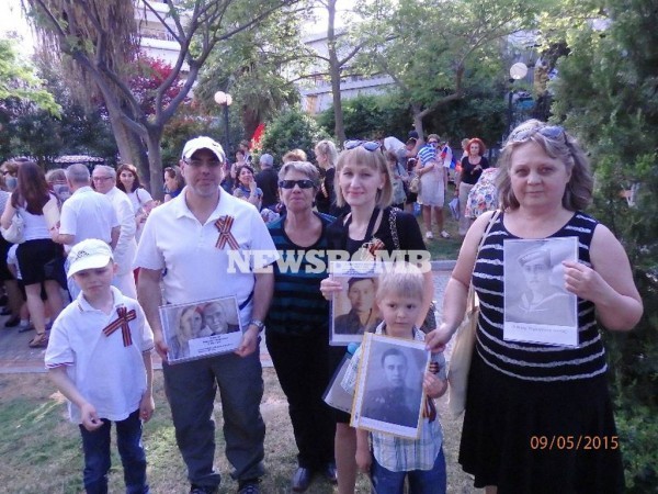 Колонна оказалась внушительная по количеству людей, шествующих в ней, а это было более двухсот человек, особенно, если принимать во внимание, что это было впервые в Афинах. Шли люди, взрослые и дети – с портретами своих героев, с рисунками, с табличками, на которых написаны имена и подвиги, просто с цветами. По пути следования колонны из домов выходили еще люди с цветами и присоединялись к Бессмертному Полку. Люди шли и пели песни военных лет, песни Победы.