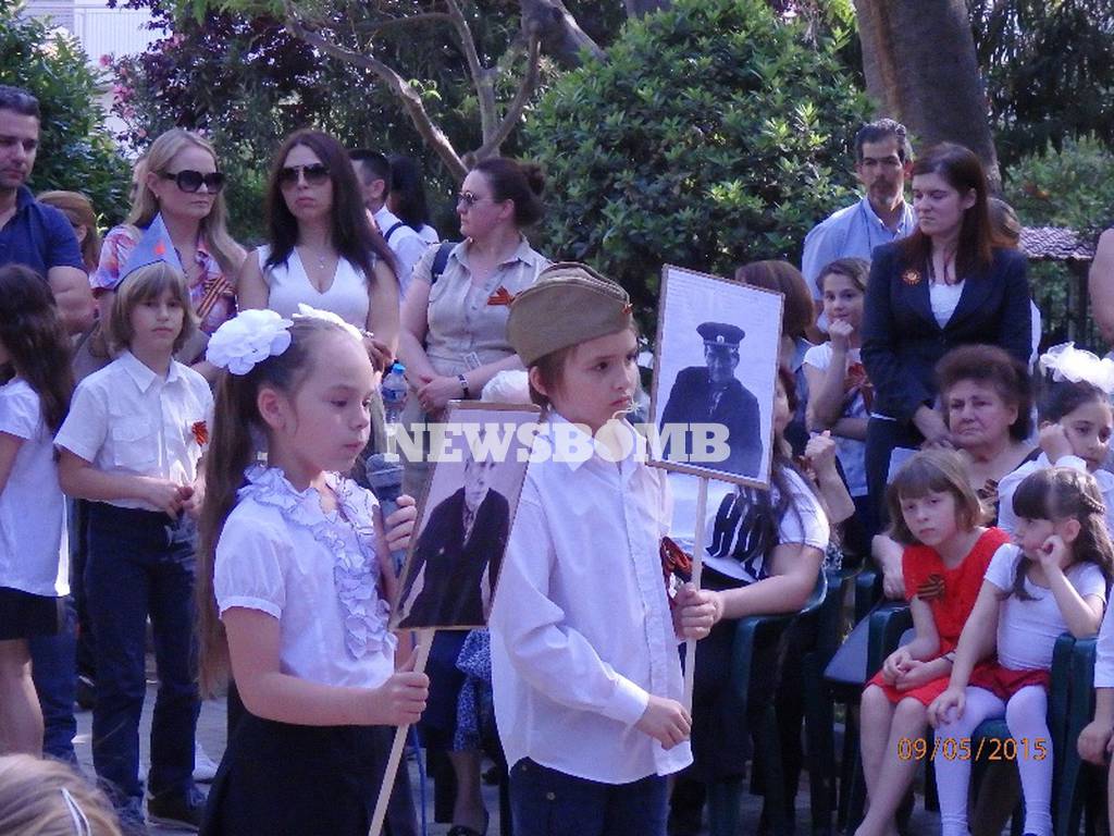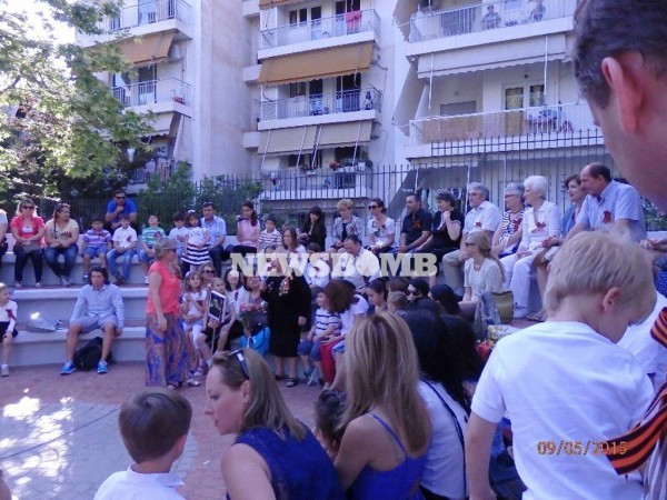 Празднование продолжилось в парке Заппион, где выступал военный духовой оркестр, на большом экране транслировалась запись парада с Красной площади в Москве. Мероприятие проходило под эгидой Афинского муниципалитета при поддержке посольства РФ в Греции, Минобороны Греции, Фонда Андрея Первозванного, КСРС и многих других организаций и компаний. Несколько подпортила празднование погода, пошел дождь, но это не изменило патриотический настрой собравшихся. Завершились торжества праздничным салютом, гостям предлагалось советское шампанское.