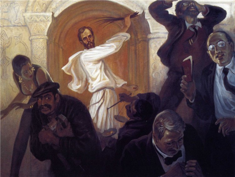 А Спаситель, тем временем, шел на вольную смерть. В первый же день после торжественного входа в Иерусалим он вошел в конфликт с религиозно-политической элитой, перевернув столы меновщиков в храме. Интересно, почему Он назвал все это дело «вертепом разбойников» (Мф. 21, 13)? Смею предположить, что финансовые операции привлекали внимание различного рода аферистов, рэкетиров, желающих войти в долю, «крышевать». В том числе, из числа «высокопоставленных». Иначе чего этим старейшинам так беспокоиться? По всей видимости, о Боге там меньше всего думали.