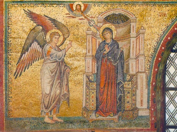 Спустя четыре месяца по обручении Ангел явился Марии, когда Она читала Священное Писание, и, войдя к Ней, сказал: «Радуйся, Благодатная! (то есть исполненная благодати Божией — даров Святого Духа). Господь с Тобою! Благословенна Ты между женами». Архангел Гавриил возвестил Ей, что Она обрела величайшую благодать у Бога — быть Материю Сына Божия.
