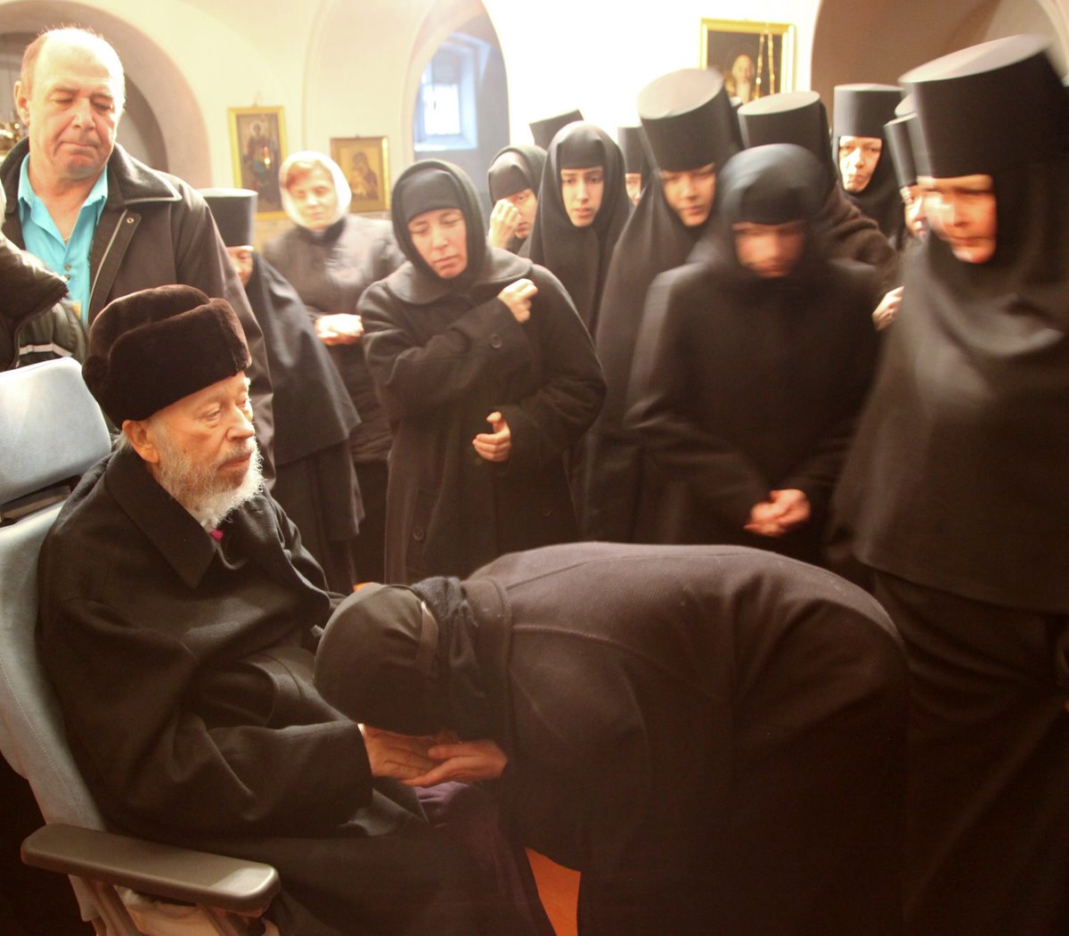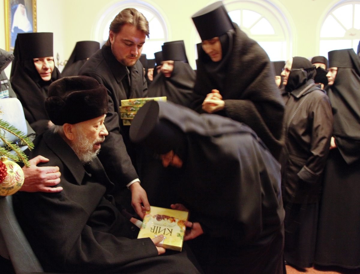 После службы, в игуменского корпусе монастыря, митрополит Владимир поздравил настоятельницу игуменью Калисфению (Шамайло) с насельницами обители с праздником Рождества Христова. После исполнения монахинями рождественских колядок, Владыка Владимир вручил им подарки.