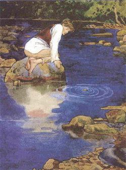 Слуга взял денежку, поблагодарил хозяина и отправился к ручью, где вода была быстра и чиста. Сел парень на бережок, достал из кармана денежку, посмотрел на нее и подумал: «Боже милостивый! Неужели я, работая целый год, заработал только одну монету? Но, может быть, я и этого не заслужил? Один Господь знает. А вот я сейчас проверю. Брошу-ка я эту монетку в воду. Если она не потонет, а поплывет по воде, то, значит, я ее и впрямь заслужил, а если пойдет на дно, то не заслужил». Встал тогда парень на берегу, перекрестился и сказал: «Боже милостивый, если я заслужил эту денежку, пусть она плывет по воде, а если я не заслужил, то путь потонет!»