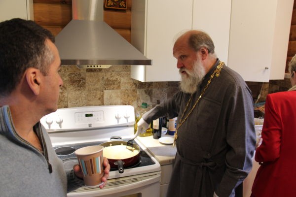 После окончания воскресной литургии отец Михаил бежит на кухню, спешно надевает на подрясник фартук и, параллельно общаясь и перешучиваясь с прихожанами и гостями (все, кто был на литургии, уже собрались в доме), готовит омлет. Тем временем в гостиной накрывают на стол, доносится аромат кофе. Суета и разговоры прерываются на молитву. Сегодня отец Михаил просит прочитать «Отче наш» Марию, по происхождению гречанку, постоянную прихожанку храма. Она читает на греческом.