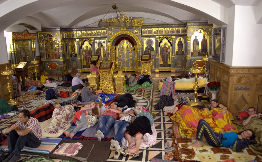 По словам настоятеля собора протоиерея Александра Пеканова, в храме постоянно находится около 400 человек, из них примерно 50 — дети. Количество людей меняется в зависимости от интенсивности обстрела и времени суток.