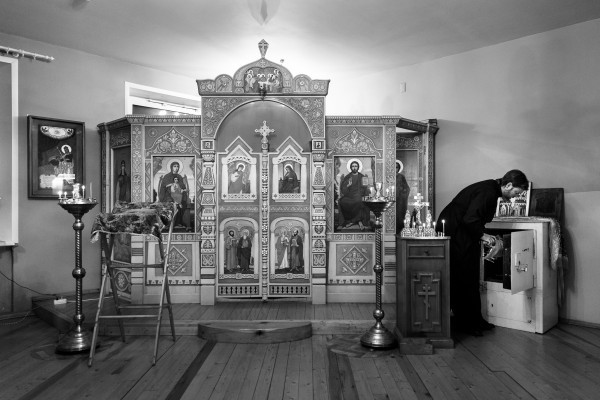 Больничный храм представляет собой небольшое помещение с двумя окнами. В углу комнаты – алтарь, в другом – аналой и уголок для певчих. Напротив туалет, уборщица заканчивает мыть пол.