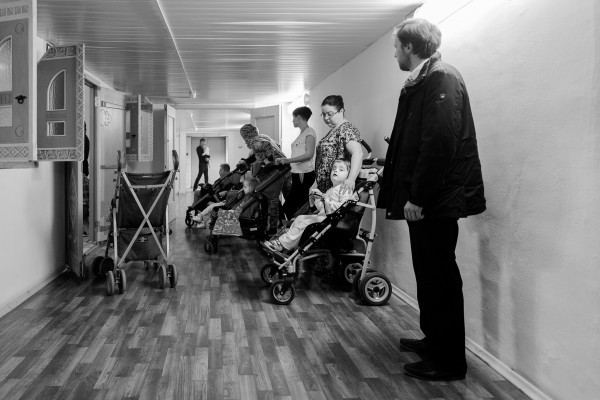 Диагнозы у пациентов самые разные: детский церебральный паралич, последствия черепно-мозговых и спинномозговых травм, аномалии и пороки развития центральной и периферической нервной системы, рассеянный склероз, эпилепсия, аутизм. На больших фотографиях при входе – улыбающиеся малыши, под фотографиями – не только подписи с именами, но и коротенький рассказ о характере и навыках ребенка. С 2002 года в больнице проводятся богослужения. Именно на него я и приехала.