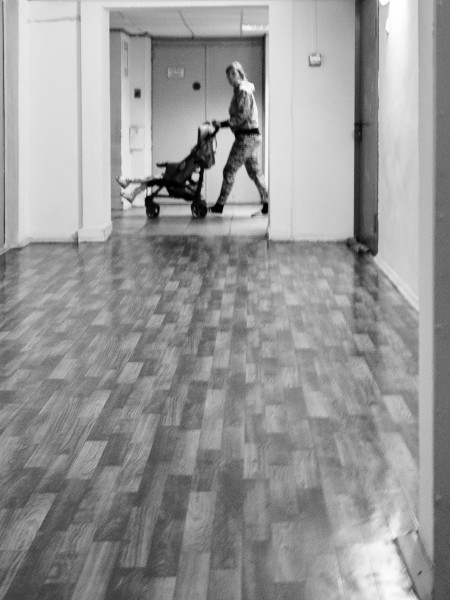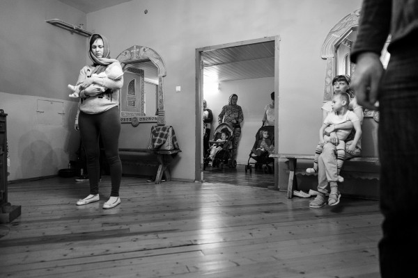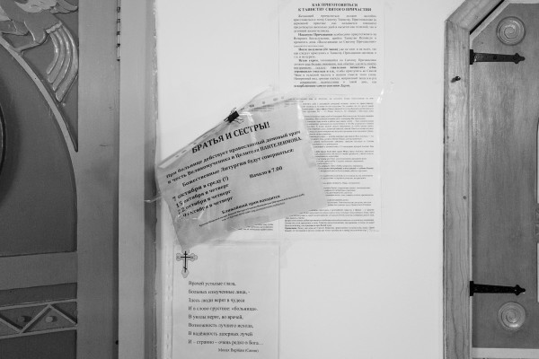 Когда в семь часов начинают работать лифты, в коридоре у храма появляются мамы с детьми. Дети сидят в колясках. Кто-то спокоен, кто-то волнуется. В храм мамы не заходят: во-первых, в тесном помещении коляски не поместятся, а держать на руках довольно больших детей не каждому под силу, во-вторых, в комнате душно, она не предназначена для скопления народа.