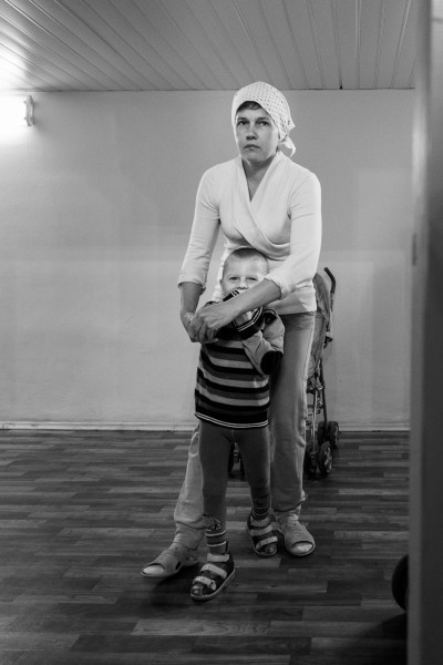 Следом приходят Ирина и Максим. Они лежат в НПЦ два-три раза в год и каждый раз стараются попасть на богослужение. Мама оставляет коляску в коридоре, садится в храме на скамейку. Но во время чтения Евангелия встает. Она держит сына на руках, видно, что ей тяжело, спина напряжена. Но она не садится.