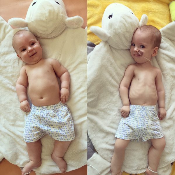 Шли месяцы, но атрофия брала свое. НИВЛ, откашливатель и Амбу уже не помогали ему в той степени, в которой нуждалось тело. Я сфотографировала его в одних и тех же трусиках: когда ему было 10 месяцев, а потом в год и четыре. На фотографиях видно: грудная клетка выглядит гораздо хуже, он очень похудел.