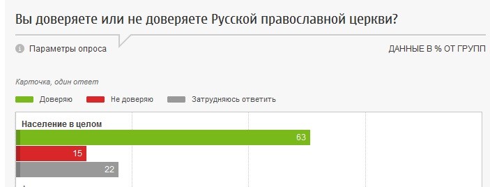 На вопрос «доверяете ли вы Русской Православной Церкви» 63 процента россиян ответили положительно, 22 процента затруднились ответить, и только 15% выбрали отрицательный ответ.