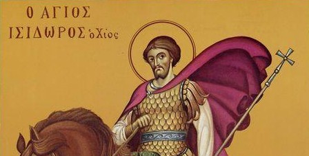Святой мученик Исидор жил в III веке на острове Хиосе, родом был из Александрии. В первый год правления императора Декия (249 — 251) был издан указ переписать всех способных служить в войсках Римской империи. Святого Исидора, рослого, с крепким телосложением, приняли в полк военачальника Нумерия. Святой Исидор был христианин, вел трезвую и воздержную жизнь, был целомудрен, избегая всех языческих обычаев.