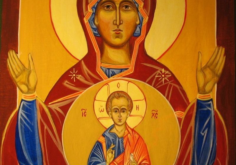 Эта икона изображает Пресвятую Богородицу, сидящую и молитвенно подъемлющую руки Свои; на груди ее, на фоне круглого щита (или сферы) — благословляющий Божественный Младенец — Спас-Эммануил. Такое изображение Богоматери относится к числу самых первых Ее иконописных образов.