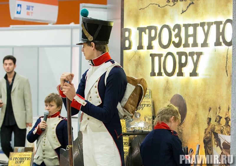 Тематика ярмарки в этом году посвящена юбилею Бородинской битвы. Поэтому книги об исторических событиях той эпохи презентуются особенно ярко – костюмированные «воины» с охотой позируют перед камерами.