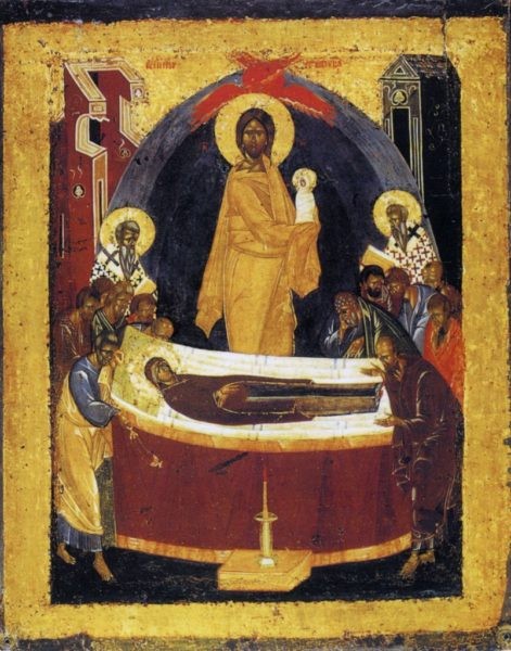 Успение — рождение в Пасхальную вечность. Там, за чертой времени, Христос встречает Свою Матерь. Иконографический образ говорит о том, что Он держит Ее душу, как младенца, на руках, как Она некогда держала на руках Его во младенчестве. Ибо именно от Нее он воспринял наше человеческое естество.