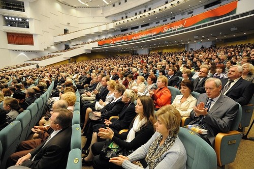 Для меня большая радость встретиться с вами здесь, во Дворце Республики, поговорить от сердца к сердцу, поделиться мыслями, которые посетили меня при соприкосновении с вашей жизнью, с реальностями Белоруссии. На балконе этого зала находится замечательный баннер, где написано: «За сильную и процветающую Беларусь». Позвольте мне присоединиться к этому лозунгу — не как иностранцу, не как человеку, который приехал откуда-то, а как человеку, для которого судьба Белоруссии означает не меньше, чем судьба России или судьба Украины. Потому что Патриарх, возглавляя все духовное наследие Киевской Руси, имеет непосредственное отношение к жизни каждого народа и с каждым народом отождествляет свою жизнь, посвящая каждому народу свои молитвы и свое воздыхание ко Господу.