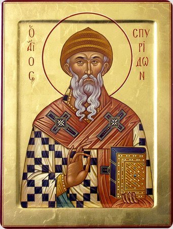 Святитель Спиридон родился в 3 веке на Кипре, был пастухом, а после смерти жены был избран епископом Тримифунта. В 325 году он принимал участие в I Вселенском Соборе, где обличил ересь ариан и показал наглядное доказательство Единства во Святой Троице. Он взял в руки кирпич и стиснул его: мгновенно вышел из него вверх огонь, вода потекла вниз, а глина осталась в руках чудотворца. «Се три стихии, а плинфа (кирпич) одна, — сказал тогда святитель Спиридон, —так и в Пресвятой Троице — Три Лица, а Божество Едино».