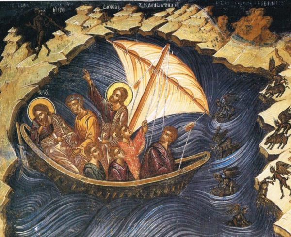 Выбившись из сил, бросив весла и видя, что они не в состоянии справиться с разбушевавшейся стихией, намокшие и озябшие, гребцы стали будить Христа: «Учитель! неужели Тебе нужды нет, что мы погибаем?» И разбудив Его, взывали Ему: «Наставник! Наставник! погибаем… Господи! спаси нас; погибаем»… Тогда Христос, «встав, запретил ветру и сказал морю: умолкни, перестань. И ветер утих, и сделалась великая тишина».