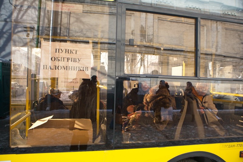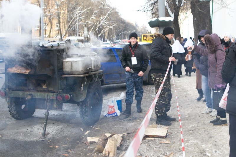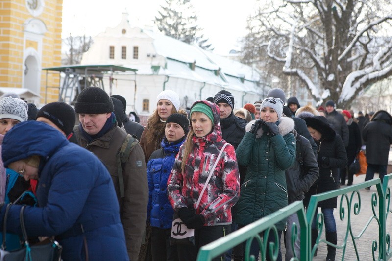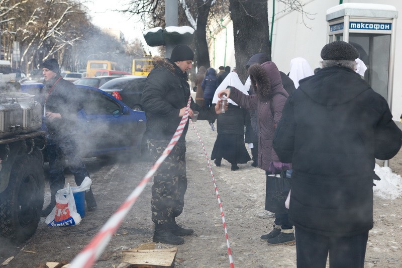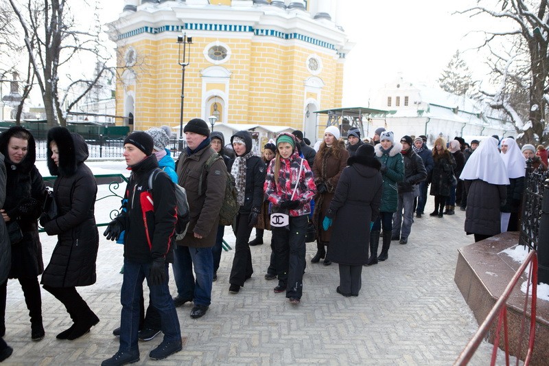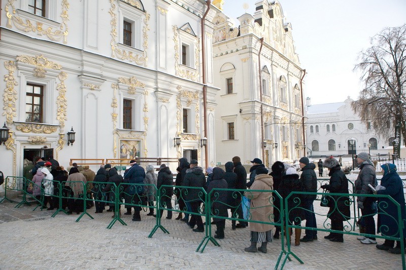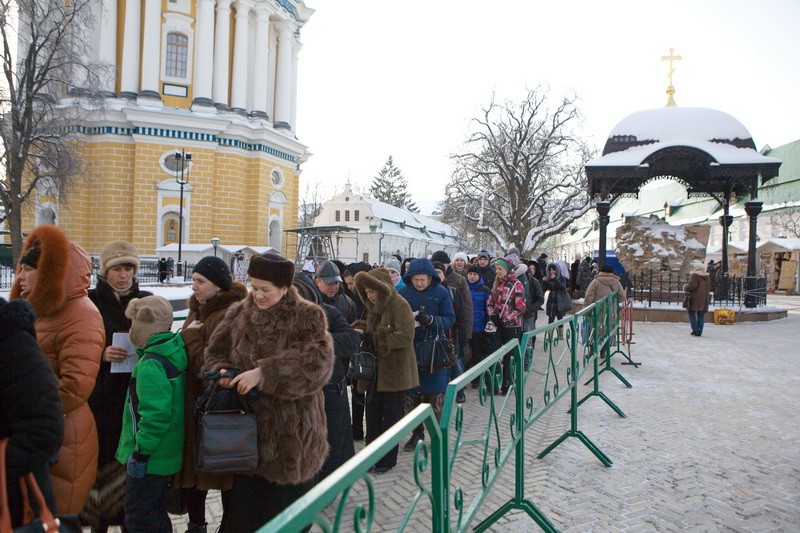 Несмотря на сильный мороз сегодня днем, 27 января, очередь к Дарам волхвов увеличилась и сейчас выходит за Святые врата Киево-Печерской Лавры. Очередь не маленькая, но благодаря толковой организации процесса люди стоят к святыне в среднем не более часа. А у лаврских ворот стоят троллейбусы для обогрева и работает полевая кухня.
