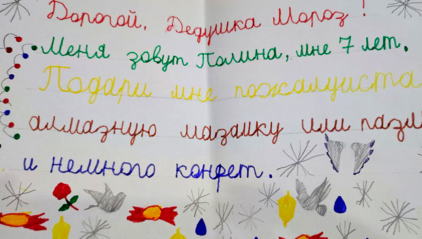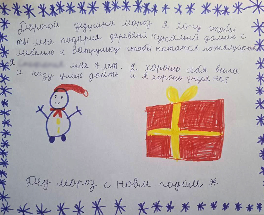 Дорогой Дедушка Мороз! Я хочу, чтобы ты мне подарил деревянный кукольный домик с мебелью и ватрушку, чтобы кататься с горки, пожалуйста. Мне 7 лет. Я хорошо себя вела, и козу умею доить, и я хорошо учусь на пять.