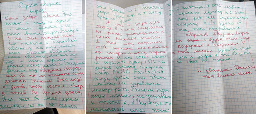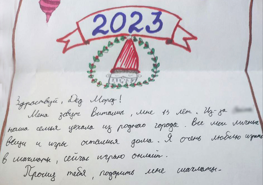 Здравствуй, Дедушка Мороз! Меня зовут Ваня, мне 7 лет. Я приехал с города Попасная, Луганская область, потому что начались [боевые действия] и наш город сгорел. Всем было очень-очень страшно, я прошу у тебя, чтобы скорее закончились [боевые действия]. Если сможешь, принеси мне самокат-снегокат, если, конечно, тебе не будет тяжело нести, и пусть у всех людей будут свои дома, и я хочу, чтобы моя овчарка была жива и чтобы ни у кого не умирали их собаки. Жду.