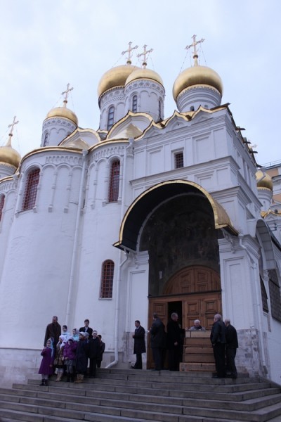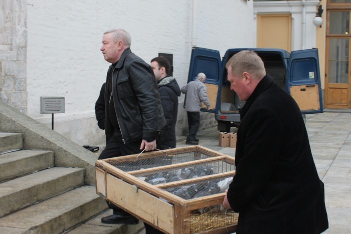 После службы нам рассказали о том, куда возвращаются голуби, с какой скоростью, как часто они теряются, и какие маленькие чудеса наблюдают специалисты, уже 17 лет привозящие к Благовещенскому собору птиц в этот праздник.