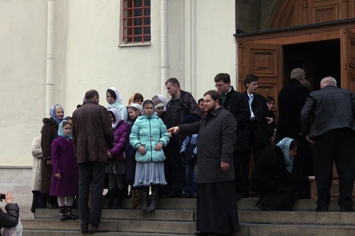 Перед храмом во всю шли приготовления к тому, чтобы выпустить голубей. Кстати, спортивных и специально обученных, которые возвращаются на свои голубятни. Пока ждали окончания службы, детей ставили как можно более фотогенично, голубей в ящиках складировали, а журналисты вздыхали, что из года в год голуби. Нет бы попугаев выпустить ради картинки. Или там аистов, например…