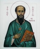 Св. Давид родился в 6 веке в Уэльсе. Он принял монашество в молодости и, став священником, много лет учился. Согласно одному преданию, его рукоположил в сан епископа Иерусалимский Патриарх, когда Давид совершал паломничество на Святую Землю. Св. Давид много трудился над распространением христианской веры в Уэльсе, особенно в его юго-западной части (ныне графство Пембрукшир). Он основал монастырь в Меневии, теперь город Святого Давида (St Davids), и его почитают как первого епископа этого места.