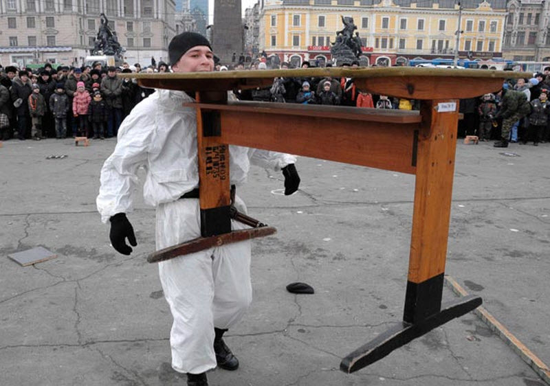 Военный несет стол в зубах на военном представлении во Владивостоке.