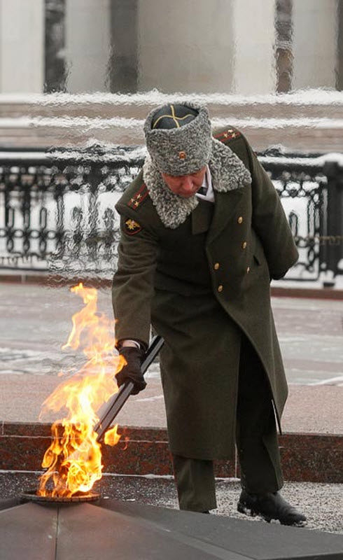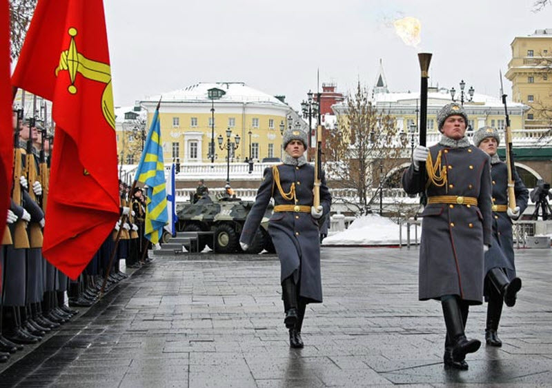 Российские солдаты несут вечный огонь на могилу Неизвестного солдата.