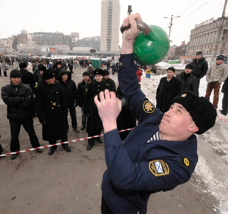 Моряк участвует в конкурсе во время празднования 23 февраля во Владивостоке.