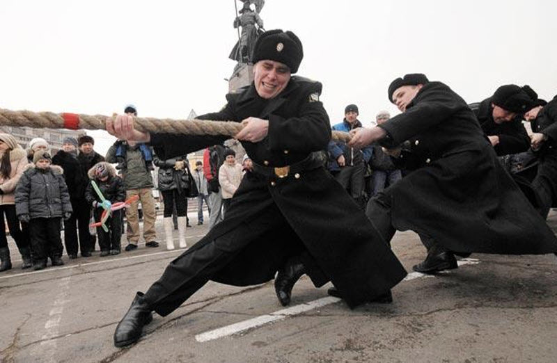 Российские моряки перетягивают канат во время военного представления во Владивостоке.