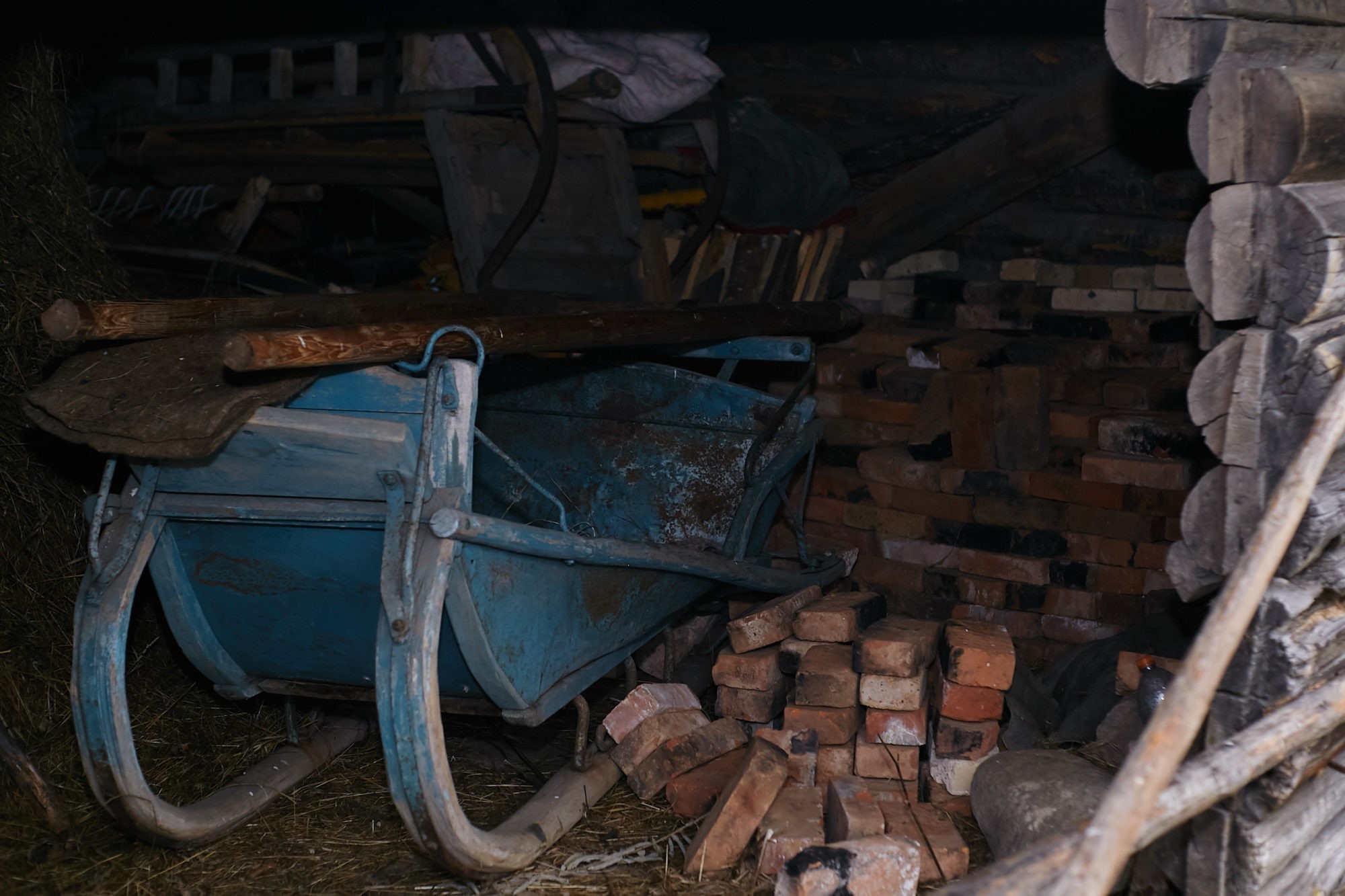 Саша выводит на улицу двух коней и кобылу с жеребенком, подносит им на вилах сено. Показывает нам старые сеялки под навесом, деревянные сани. В это время его низкорослый кряжистый конь идет прямо на меня, кивая головой с огромными глазами. Он задевает меня боком, делает еще несколько шагов и разворачивается, чтобы снова пройти мимо меня. Приглашает таким образом если не покормить, то хотя бы погладить. Войти в их свойскую компанию.