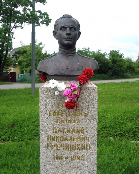 Герой Советского Союза. 30 сентября 1943 г. около Ленинграда советские авиаторы наносили воздушный удар по войскам противника. В операции участвовал и известный русский летчик Василий Гречишкин, который на тот момент совершил уже 152 боевых вылета. Однако эта операция стала для героя-авиатора последней. Самолет Гречишкина был подбит, и летчик решился направить горящую машину на вражеские артиллерийские батареи.