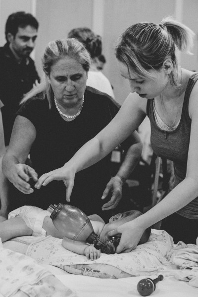 Другой папа слушает доктора Мастеллу вполуха, он пританцовывает и напевает своему маленькому сыну, расхаживая туда-сюда. Кьяра кладет младенца на стол и показывает, как работать с мешком Амбу, ручным аппаратом для искусственной вентиляции легких, помогает маме отрегулировать степень нажатия и частоту. Объясняет, как слушать дыхание ребенка, на что обратить внимание.